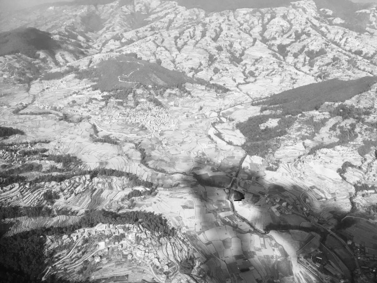Soon, the coast appears, a web of branching channels funneled through mangrove forests that ray out as far as the eye can see. There salt meets the flowing fresh water. On over the land the mangrove fades into jungle and farmland, and the innumerable branches of water begin to wander together, eventually forming a discernable trunk. At certain points, especially just after the big city of Dhaka, the trunk of green water, the Padma River, splits in two here becoming Ganga on one side and Brahmaputra or Tsang Po on the other. These trunks wind through the plains, perambulating across the fertile soil, until they reach the hills. There, like in the mangroves, the main trunk divaricates into smaller streams eventually reduced to a trickle at the foot of enormous spaces of white punctuated with crevasses and granite peaks.