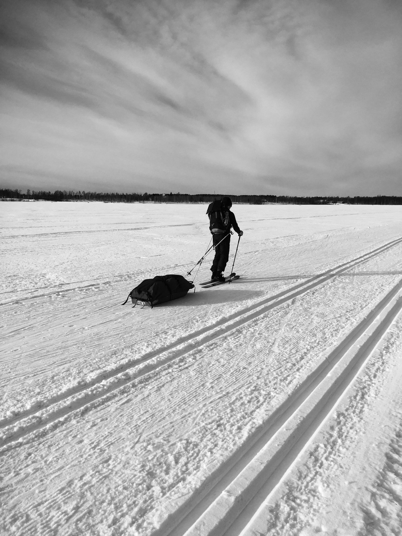 The next morning I awoke at dawn after a night of fresh snow, my thermometer read -23 Celsius. Seven inches of the fluffiest snow imaginable blanketed the birch stand where I was camped north of Haparanda on the riverbank. I packed up my camp and set off to go back to Riekkola to see the mouth of the Torne River where it enters the Bay of Bothnia, before heading back up towards my pulka (sled) and on into the north.
