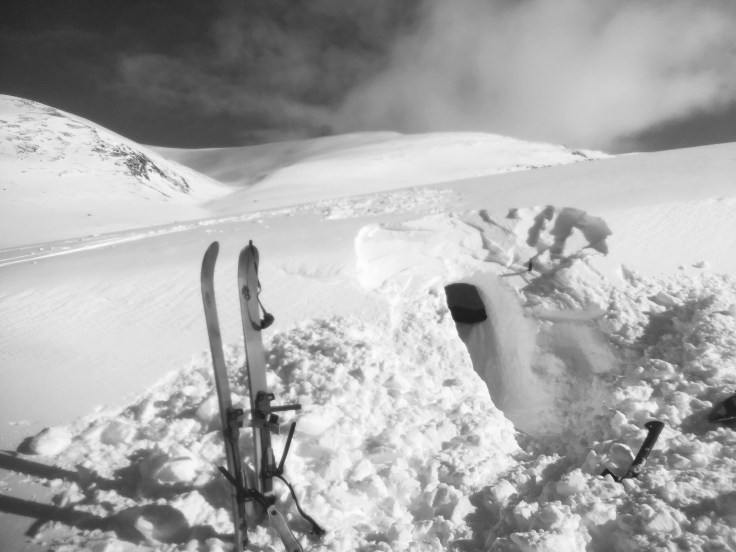 In a narrow valley between Gárddenvárri and Šiellanjunni, beautiful Sámi-named peaks, I dug into a snow ridge to build a home for myself for the night. The exercise was not as quick as I imagined, and after four hours of steady digging, and soaking myself to the bone to recreate the blueprint I had in mind, I had a wonky but functional snow cave where I could intern myself into the mountain for the night, but not before catching some turns.