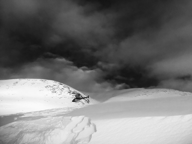 Returning to my cave, dry and happy after my ski, I cooked up some dinner. Moments after digging in, a helicopter nearly shaved my head, and flew out of sight over the windridge, but the deafening sound told me it was landing. Like a nervous rat I scurried up the wind ridge to ensure that my house didn’t cave in, and the heli was just a hundred feet away. Then I looked up and saw some dots flying down Šiellanjunni—heli skiers.
