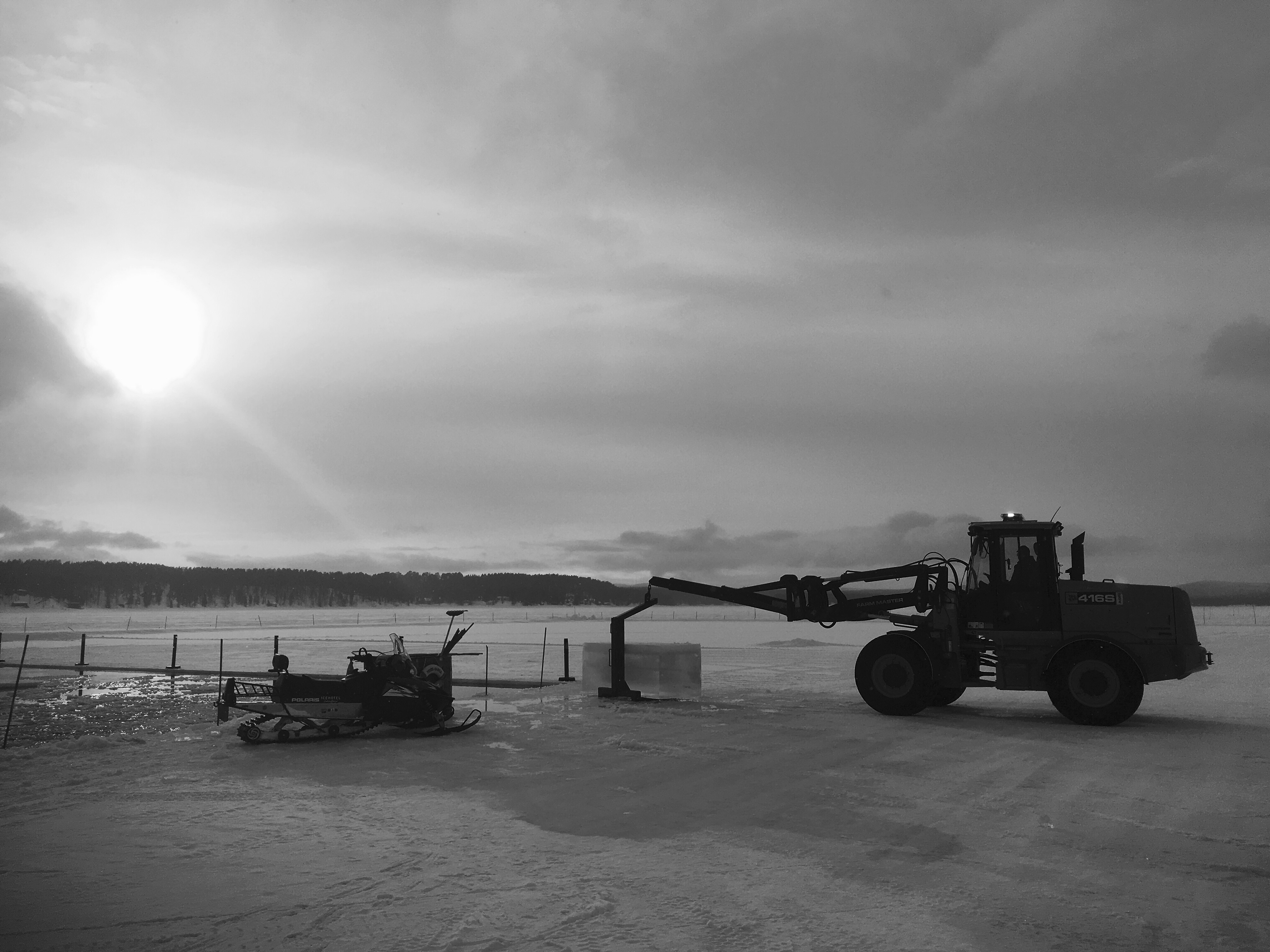 From a long way, I could see machines on the ice, it’s real, I thought, knowing that these belonged to the Ice Hotel. On the google earth image, Jukkasjarvi still has ice on it, and the ice hotel is a white pile of melting snow surrounded by the green pixels of spring. An hour of skiing after I first saw the machines, I was standing by the giant tractor forklift pulling two tonne blocks of 3 foot thick blue ice out of Torne. I talked to the guys working out there for a while and they pointed me to where I would stay the night.